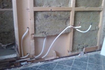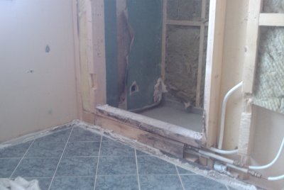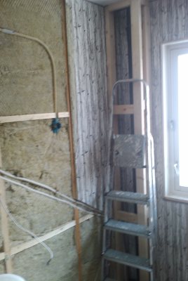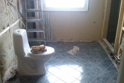 Er permittert idag, så da passer det jo fint å rive litt bad. En skikkelig hobbysnekker som har jobbet her tidligere. Ikke bare har han bygget et bad som ikke var tett, men han har bare bygget det rett oppå det tidligere badet – som også hadde vannskader! Må jo le litt når jeg ser det når jeg river. Heldigvis skal begge disse badene nå bort. Idag har de resterende flisene med gipsplater blitt revet. Og jeg har også begynt på sponplatene bak dem. Så som dere kan se så har jeg kommet helt ned til isolasjonen på mange steder.