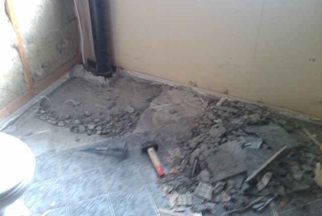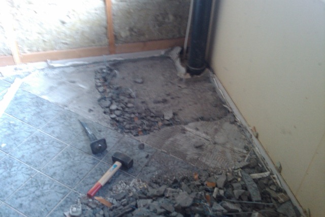 Hadde egentlig tenkt å vaske vinterhjulene før sommerlagring idag. Men det var for kaldt ute til slike aktiviteter. Badet er nå ihvertfall inne, og der er det jo nok å gjøre. Så da fortsatte jeg med å rive litt der. Resten av kassa rundt lufterøret er revet, og resten av sponplatene er nede. Fortsatte med Supermario hammeren min på gulvet. Her skal jo alt vekk. Har ikke fått tatt så mye der ennå, men det går jo fremover.