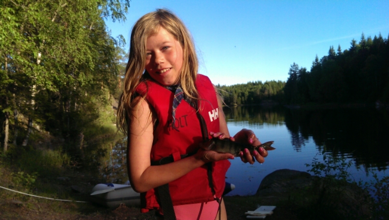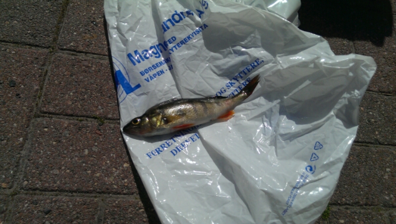 Så når båt og telt var på plass, og vi fikk spist littegrann. Så var det ut for å fiske. Allerede etter noen minutter kom den første lille abborren, og like etterpå kom det en til.