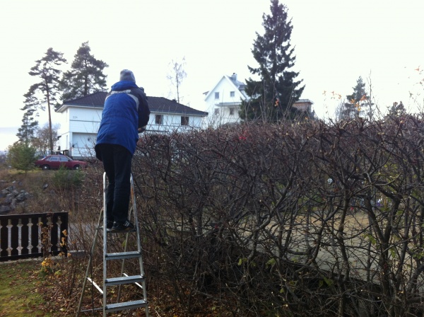 Idag er det hekken mot naboen som har fått seg en vinterklipp. Har lagt ved et illustrasjonsfoto som viser hvordan man ikke skal stå på en gardintrapp. Man skal altså ikke stå helt på toppen slik som jeg gjør her.