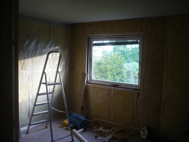 Idag var det soverommet som skulle til pers. Fikk lagt dampsperra i taket og lagt 0.20 dampsperre på veggen. Nå har vi akkurat fått opp de store gipsplatene på taket. Det mangler noen småplater her og der. Men det kan jeg gjøre alene. Anja måtte til pers for å få opp de store platene.